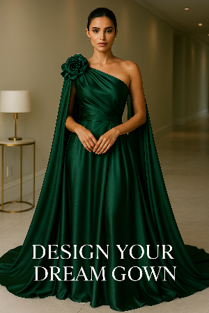 A dreamy off-shoulder dark green gown adorned with three handcrafted fabric flowers.