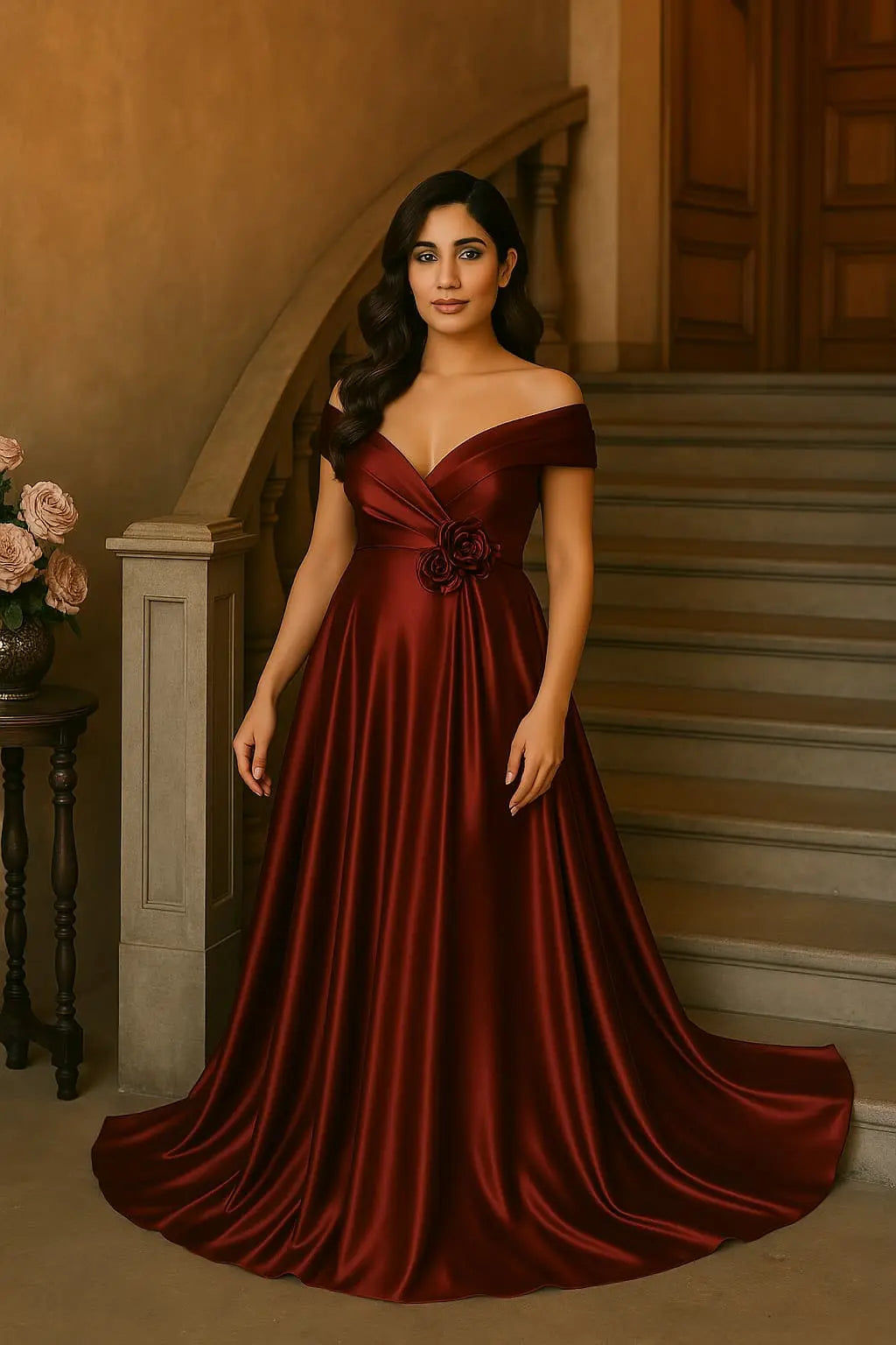 Rose Dusk is a maroon-red off-shoulder gown designed to flow with grace. A statement 3D flower at the waist adds a romantic, sculpted touch. Perfect for evening elegance, where every step feels like poetry.